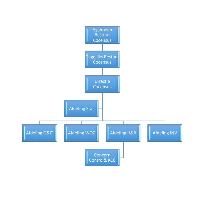 De organisatie van Cocensus bestaat uit het Algemeen Bestuur, het Dagelijks Bestuur, de Directie en de afdelingen Staf, Gegevens en IT, WOZ, Invordering, Heffingen en Bezwaar, Concern Control en het Klantcontactcentrum (KCC).